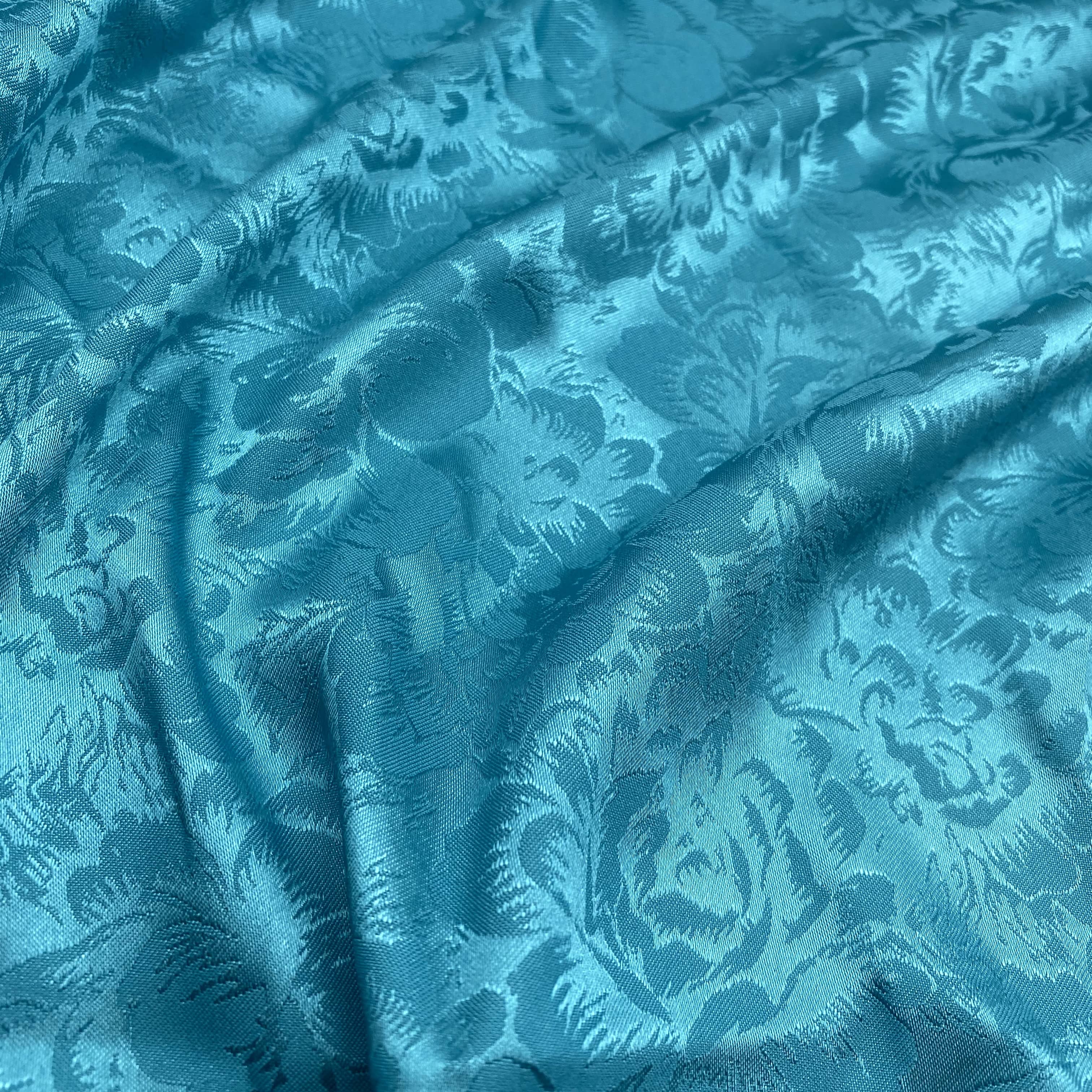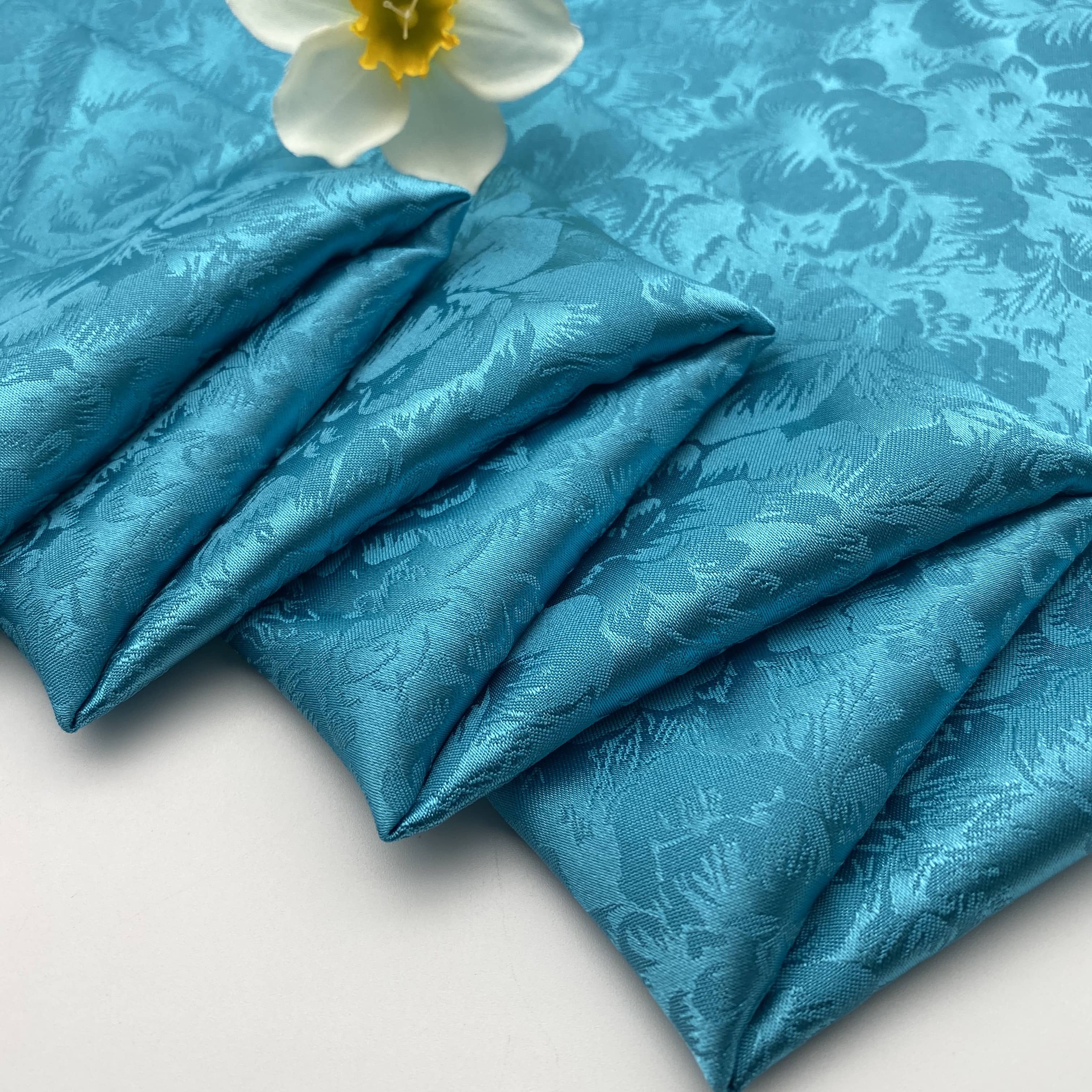 This jacquard polyester satin fabric is made of 93% polyester and 7% spandex, offering a medium weight of 103gsm with excellent stretch and wrinkle-resistant properties. Ideal for dresses, bridal wear, and special occasion garments, it features a floral pattern and is available in turquoise. Suitable for various apparel uses, including swimwear, sleepwear, and jackets.
